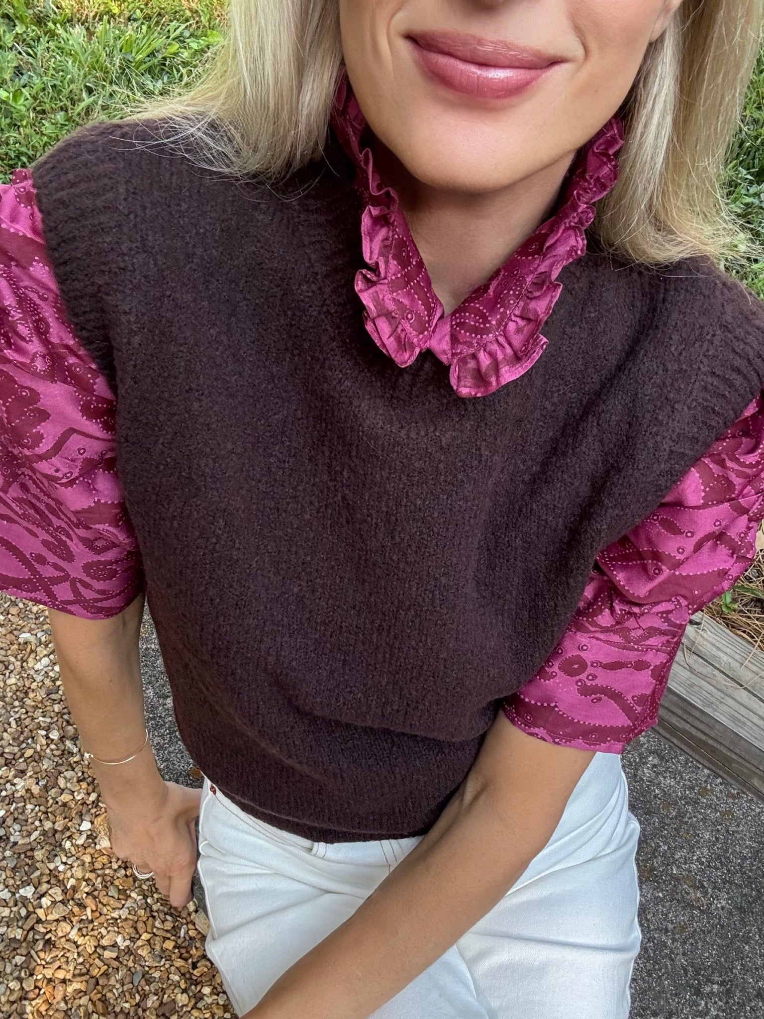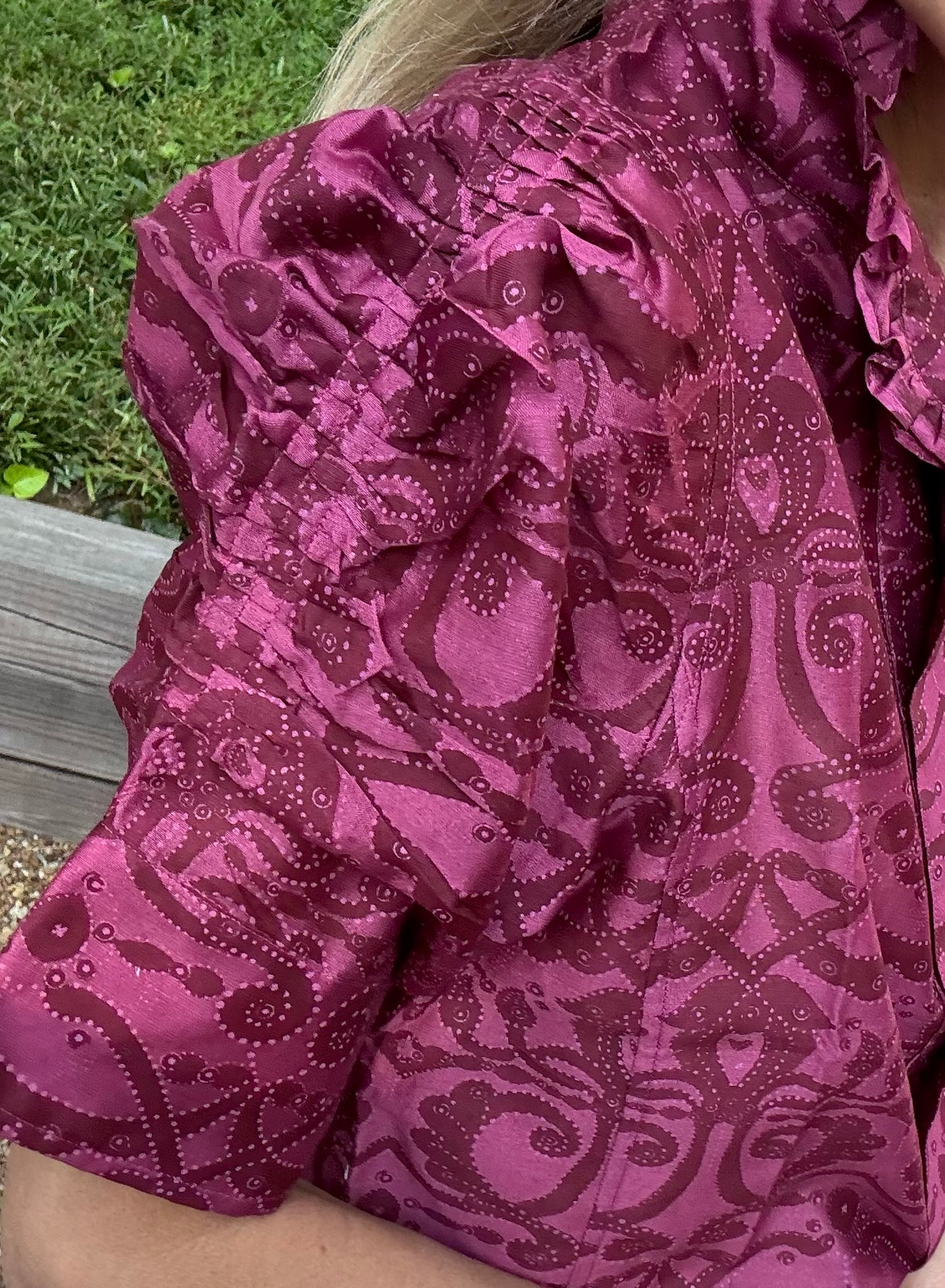 Vita is an all-time favorite blouse, and a staple in every Thierry Colson collection, just as her big sister, Venetia is. Vita is simply the blouse form of Thierry's iconic Venetia Dress. Here she is done in a stunning cotton silk blend called Chanderi in a vibrant crimson. Juxtapose it with denim, layer it one of our Masscob sweater vests, or dress her up for all your holiday events with a skirt or trousers, either way, Vita will always turn heads!