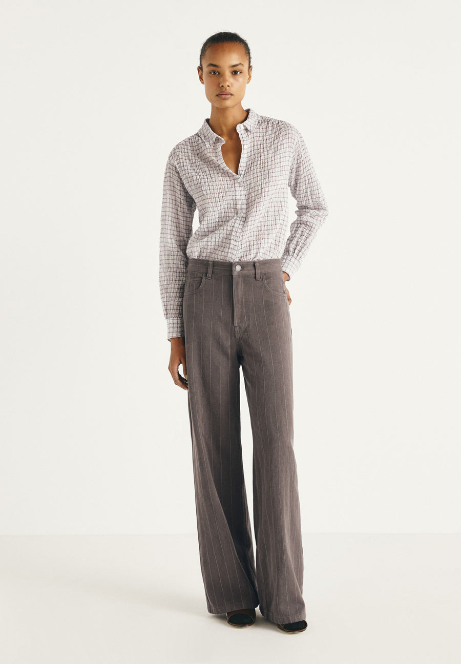This fabric is what Masscob is known for.  Crinkly cotton, great texture, fabulous as the leading lady, or under sweaters and jackets.  Also, we love the pattern play with the Masscob taupe Pardals pants.  This "notebook" colorway is a very faint navy and burgundy.